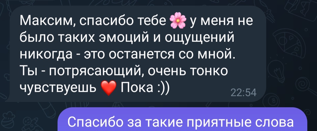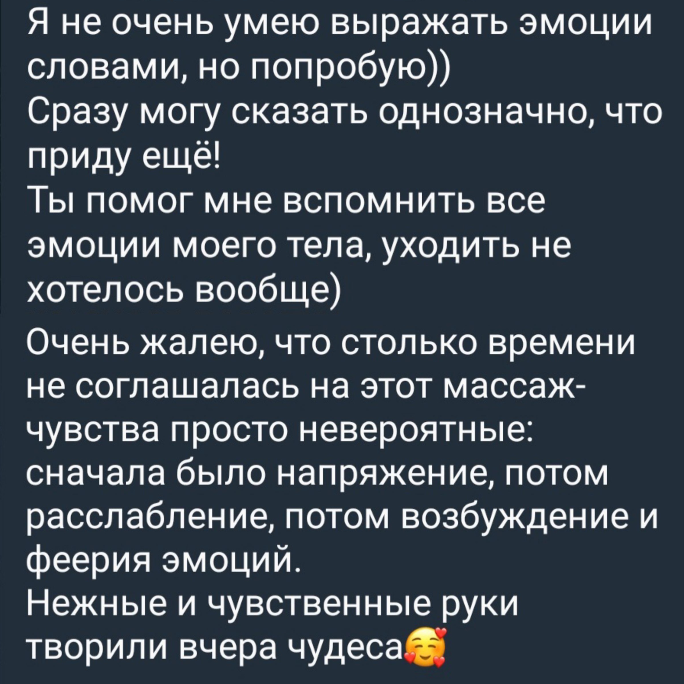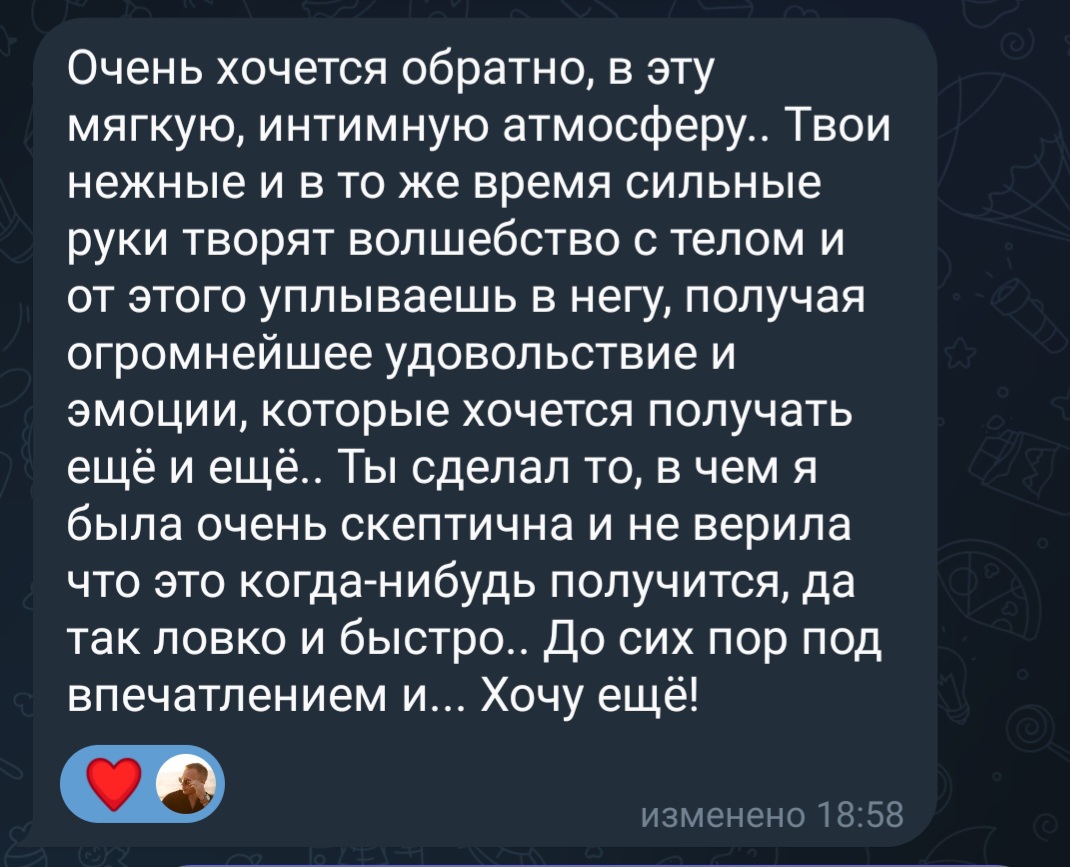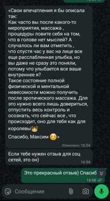 Отзывы о моих сеансах эротического массажа и обучения. Скопированы из личных сообщений в социальных сетях, из личных сообщений с мобильного телефона.